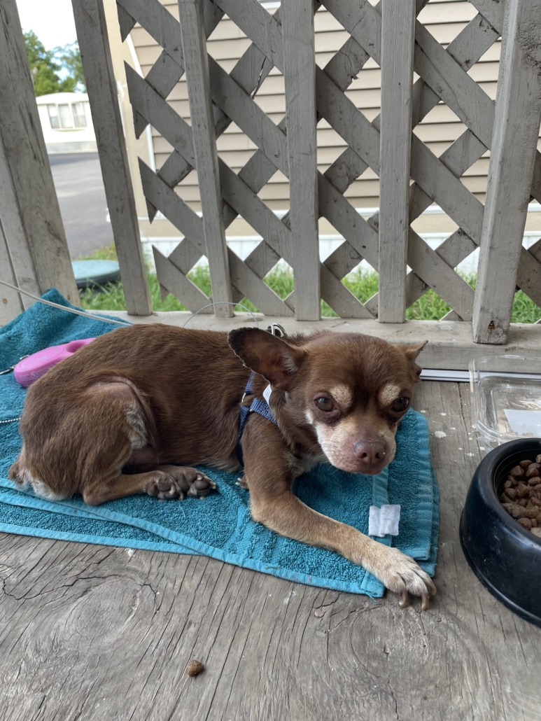 Male unneutered brown chihuahua. Appears to be young and not in the greatest shape. Thin with fleas and hairloss