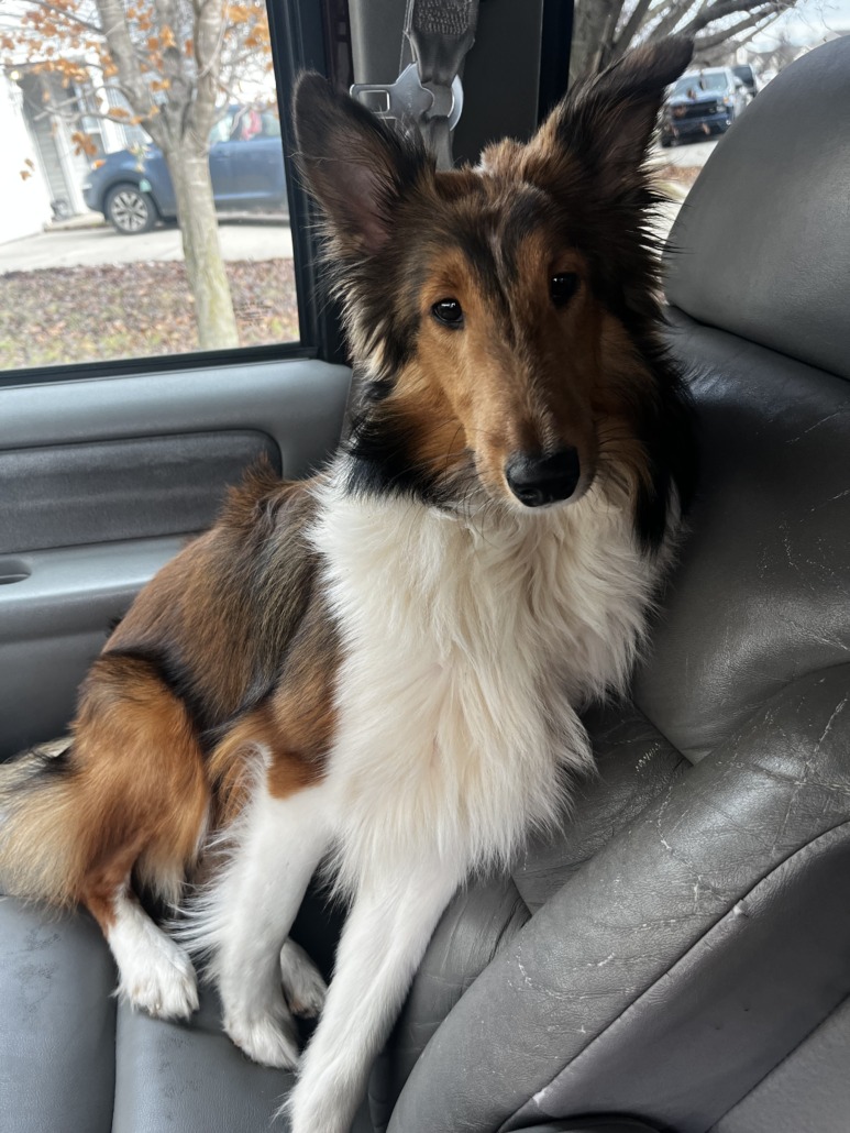 1 1/2 year old Male Sheltie. His name is Duke. He loves squeaky toys and treats. He has a black color. All paws are white. He’s a good boy.