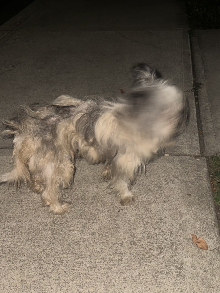White male dog, looks to be either a shih tzu or a Maltese, extremely malnourished and extremely matted. Looks to be approx. 6-12 if not older