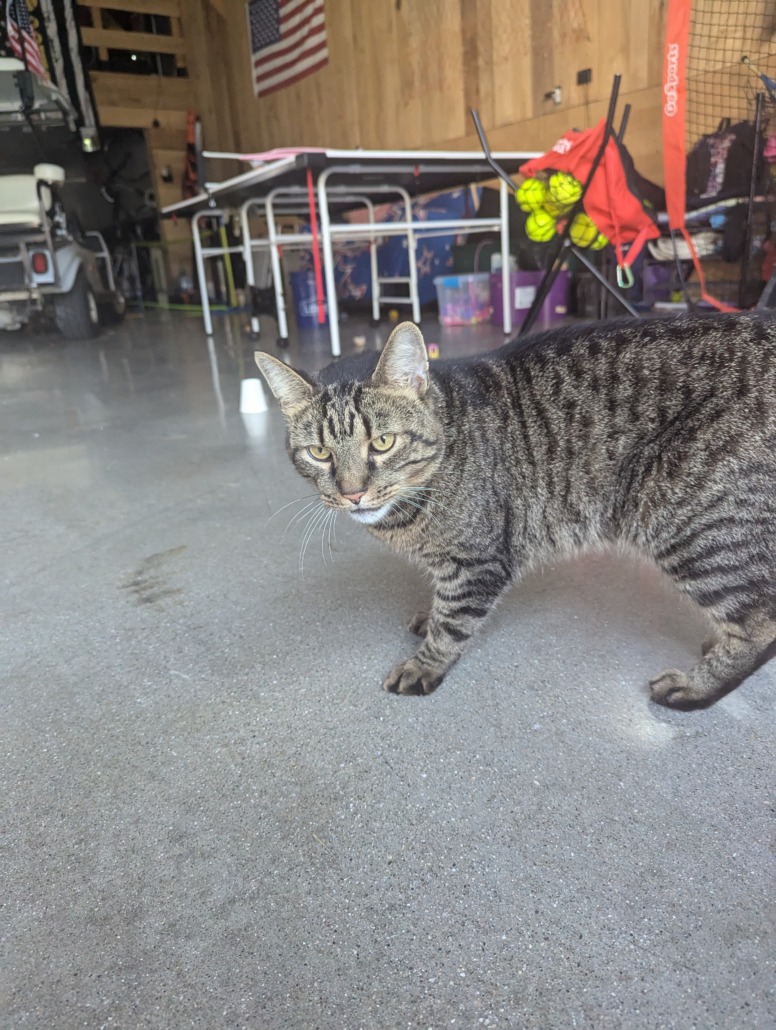 This guy/girl has been coming around our house for about a month. I try to get him/her to stay, but it takes off before I can check for a microchip. It eats the food I sit out most days.