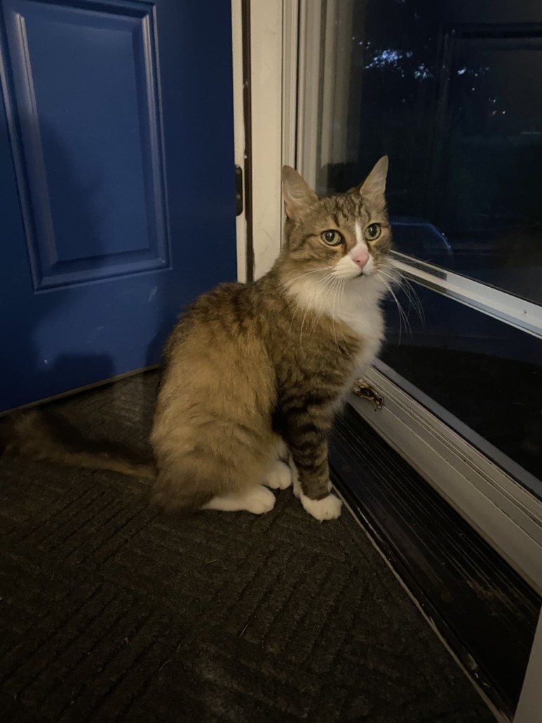 FOUND CAT: male, neutered, and declawed on both of his front paws. He looks like a tabby with tan/brown/black striping with white fur on his face and chest. He’s very friendly, walks with a slight limp, and the vet said that he’s malnourished and does not have a microchip. Proof of ownership is required.