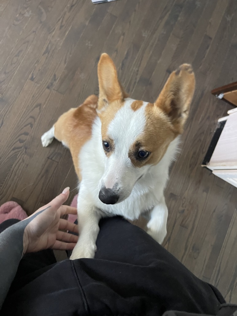 Male corgi, white and brown. Not fixed. Sweet boy, very well mannered. Was wearing shock collar, but no actual name tag.