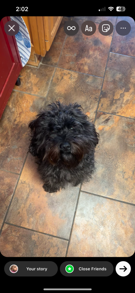 he’s small and black, he had brown hair around his mouth. he has white hair on his chest. he has a grey collar on his hair is medium length