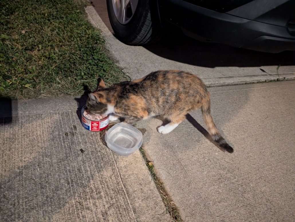 Friendly, but skittish. Didn’t seem starved or super thirsty when offered food and water. Soft, not matted. Kinda skinny in my opinion, but not super emaciated. Could just be a small cat.