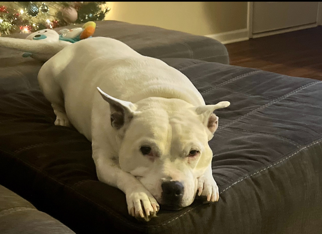 White bull terrier. Very old. Very nice. He is almost deaf so may not respond to his name.