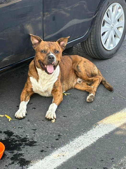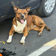 Large brindle dog hanging out outside the West Indianapolis Public Library. Very friendly dog, shows no aggression to humans or other dogs. Dog has a slight limp.