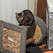 Small brown tabby with black stripes and spots, only has right eye and has asthma