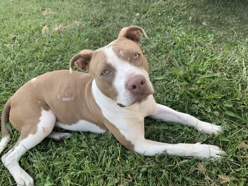 Female pitbull. Mostly brown but also white. Has scars all over her. Not chipped. Seems to be crate trained, potty trained & does listen to basic commands.