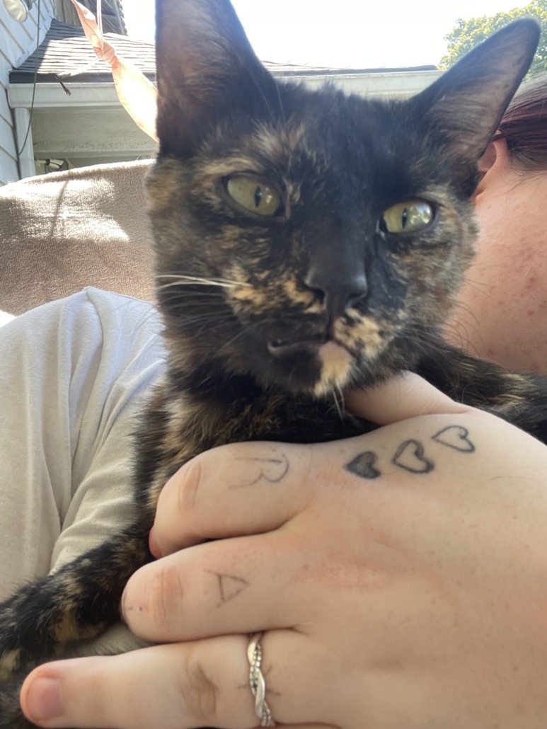 Black &’ orange cat very sweet mostly likely means she has a home proof of ownership is required