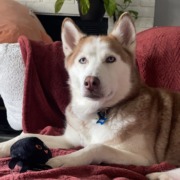 White and Rust colored Husky with Blue eyes.