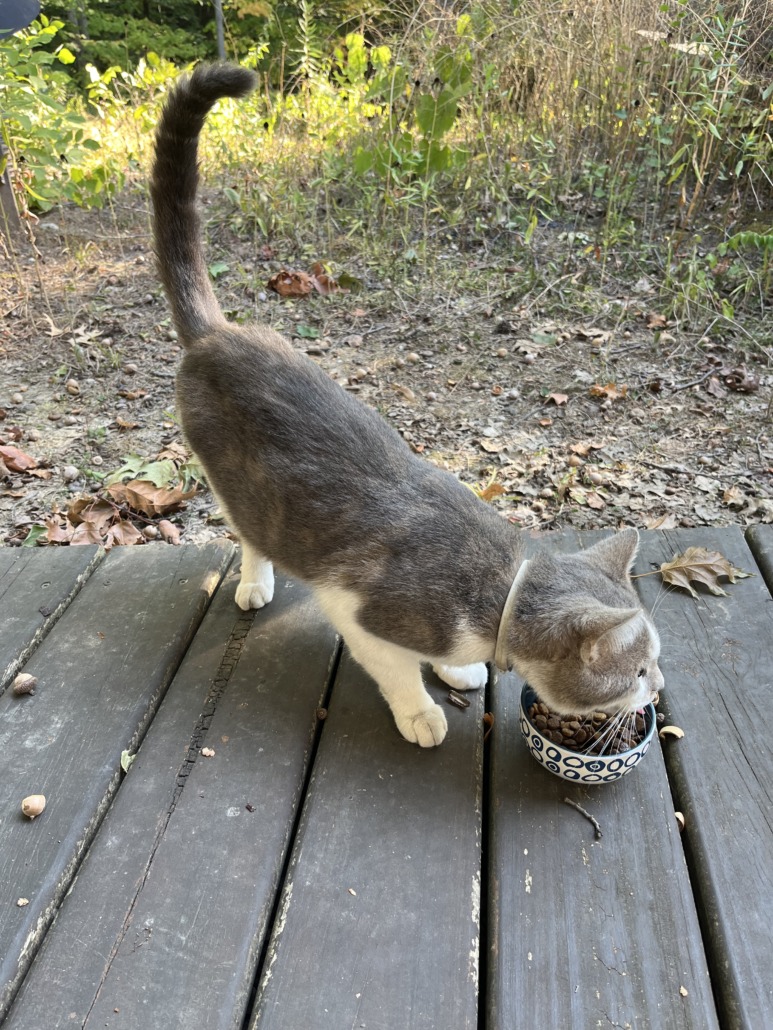 White/gray male cat with only a flea collar. He is super sweet. Lets myself and my teens pet him with no problems.