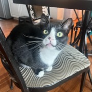Tuxedo cat with black spot on his nose. Very friendly and loves people.