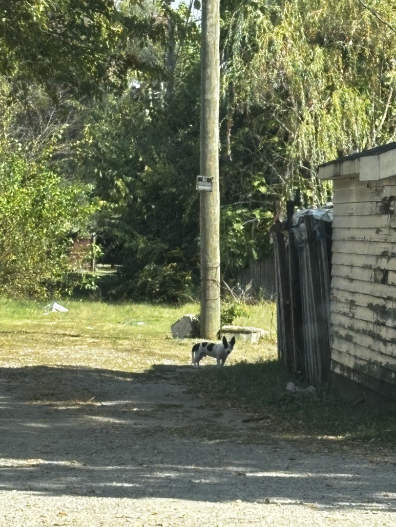 Small black and white dog. Seems to want to chase large loud trucks. Barks and runs when approached.