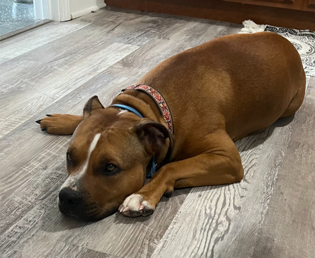 Identifying markers – left paw is white with white nails and one back white nail. Large nipples indicating she has been pregnant before, but looks like she was spade after the fact. Vet estimated she is between 1.5 and 2 years old.