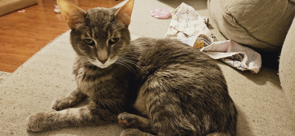 Milo is a grey short haired tabby. He is 15 years old and is very skinny throughout his hips due to age. He’s very friendly and loves food of any kind.