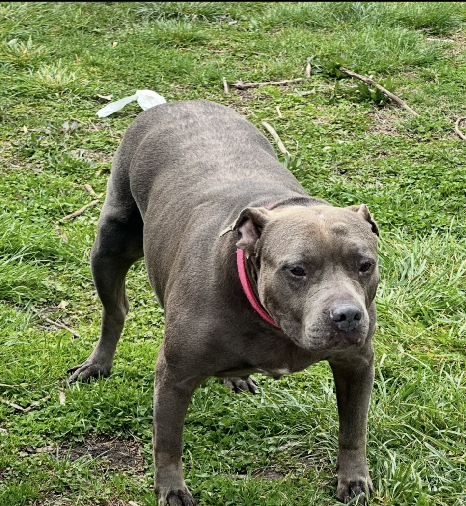 Grey female pit, has fur missing on her back, has a little white on her belly, she is old and has hip problems so she has trouble walking distances.