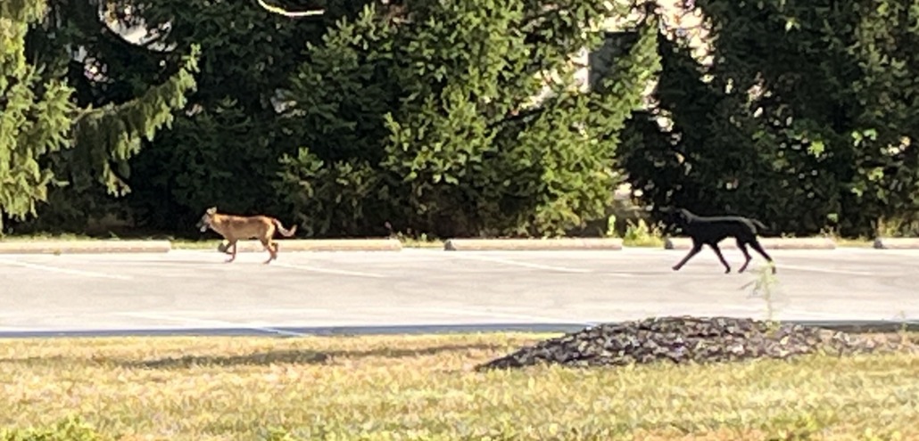 The black dog is following the other and they have been traveling around the business park together exploring. They ran away when I got their attention.