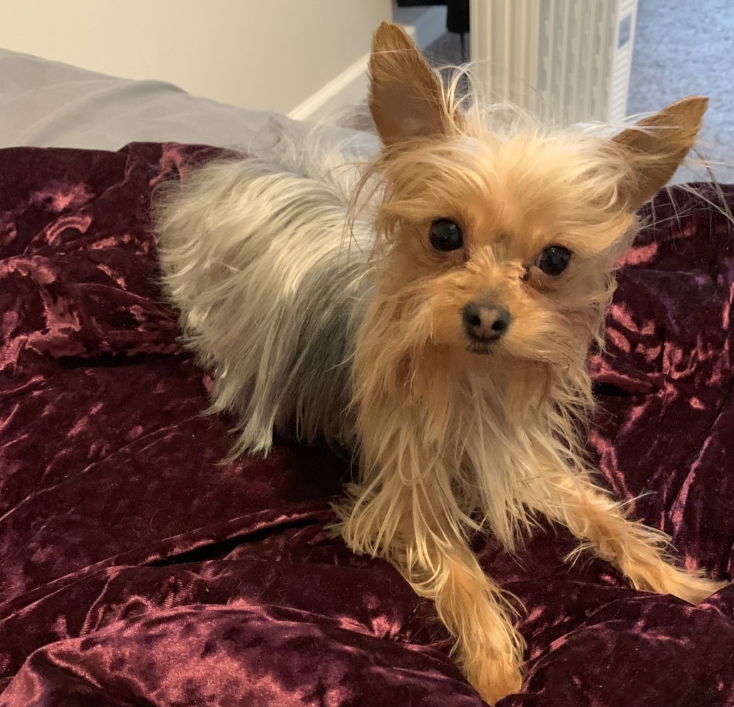 Full breed yorkie terrier tea cup 6 years old 2 1/2 pounds grey and blonde with long hair