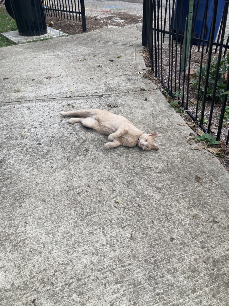 Male dilute orange tabby with red/reflective collar without tags. Did not like tuna flakes. Was not afraid of me, but not keen on pets.