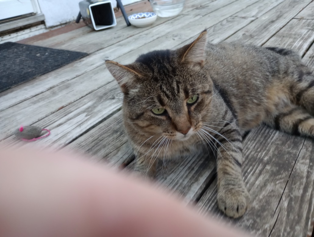 Large solid cat, (not fat). Tiger-look in browns, black, tan, gray. Very friendly, loves to be petted. Will gently bite hand to let us know he does not want