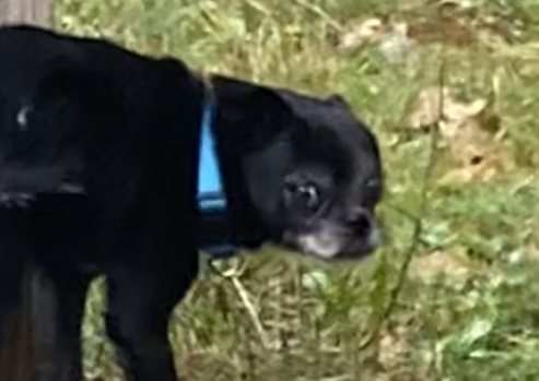 Small black male, blue collar, very skiddish, tail tucked with a slight limp, but can run very fast