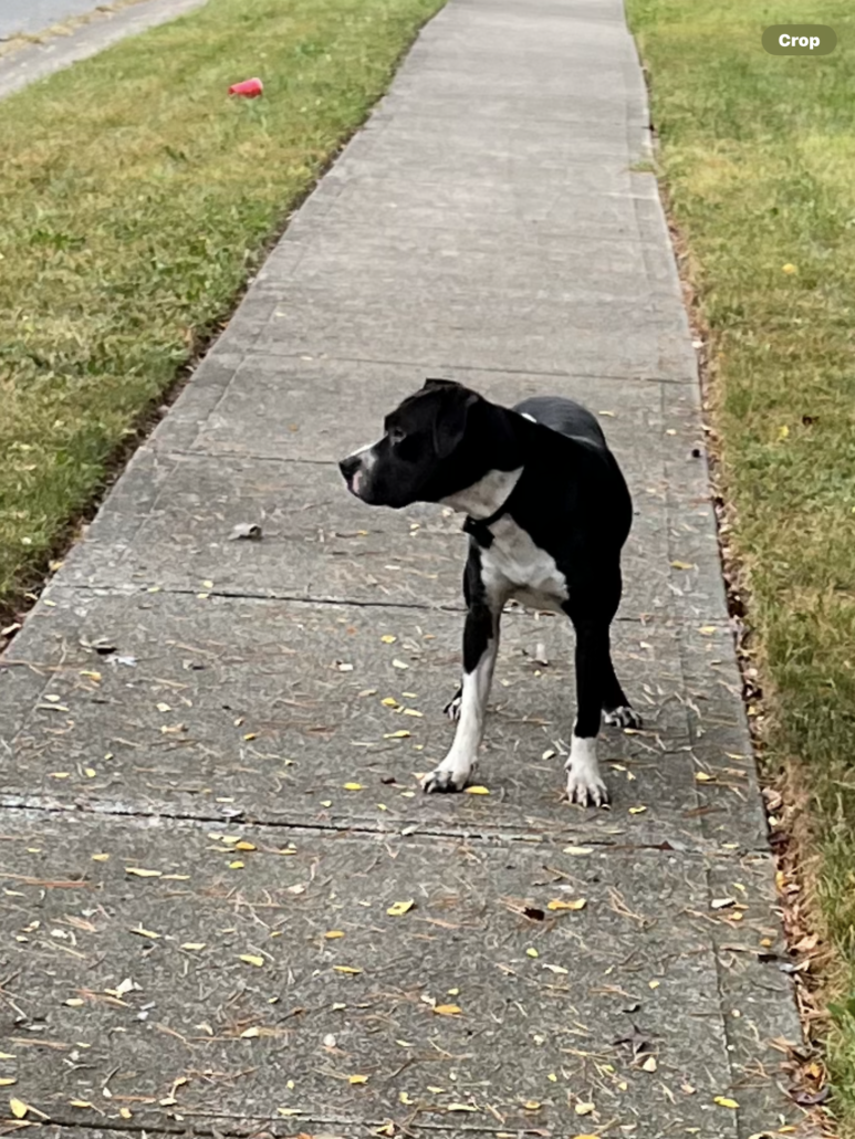Black and white dog, dark collar seen in Stratford Glen/liberty Creek off of Vicksburg by the clubhouse this morning at eight thirtyish a.m. very nice did not approach us, but I did pick my dog up and walk across the street to the other side