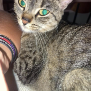 She’s a tabby with a scar from flee collar on the back of her neck and some orange-ish color on her belly.