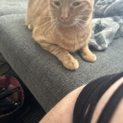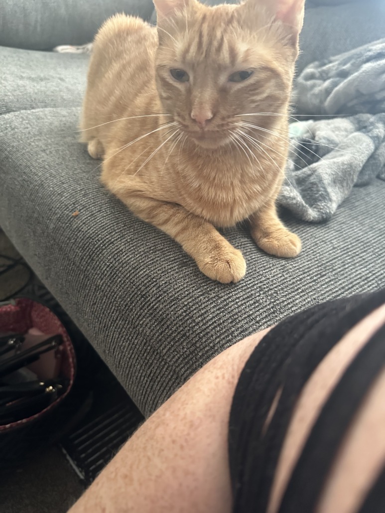 She is a orange cat with a pouch from being fixed. She will come to “babygirl”. She does not like to be picked up or held.
