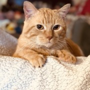 Bo is nearly 8 years old He is a little chunky. Skiddish to new people and cuddles with friends. He has a bald spot behind both of his ears due to his excessive scratching with allergies. He is probably around 10 pounds and not declawed.