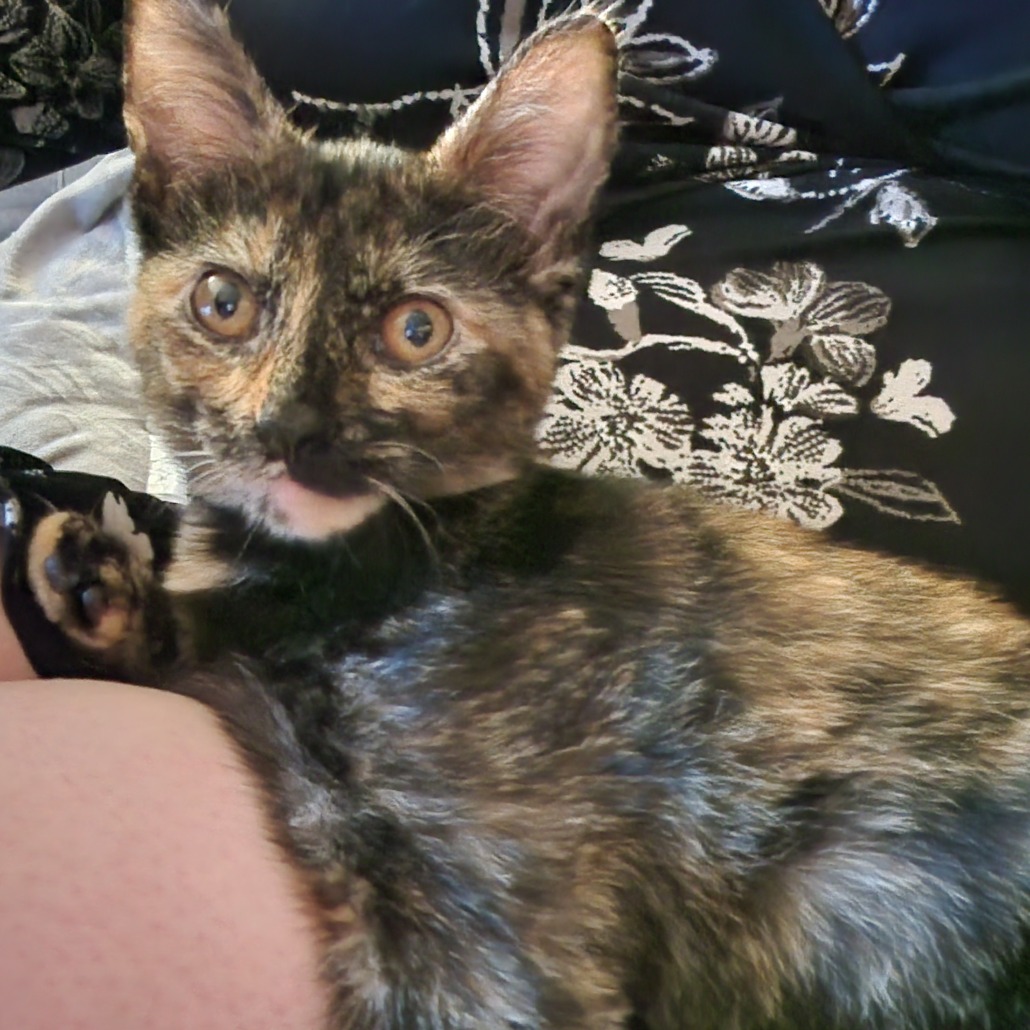 Spayed 4-5 month old female tortoiseshell/tortie mostly black with orange patches. She is very talkative and cuddly and friendly with humans and cats. She is small and roughly 5-7lbs. She is fast and likely ran out of our apartment.