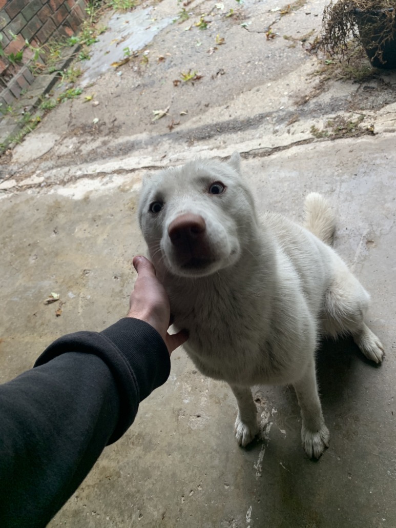 All white husky with blue eyes, no collar and no chip