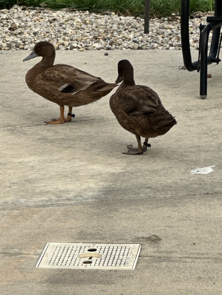 Confirmed Domestic Ducks with tags. Neither can fly or quack loud. They are very attached to one another.