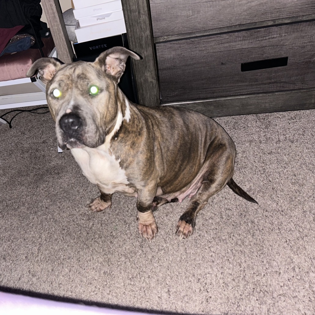 Brindle female looks like she just had babies not too long ago. Sweet as can be. No collar