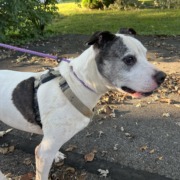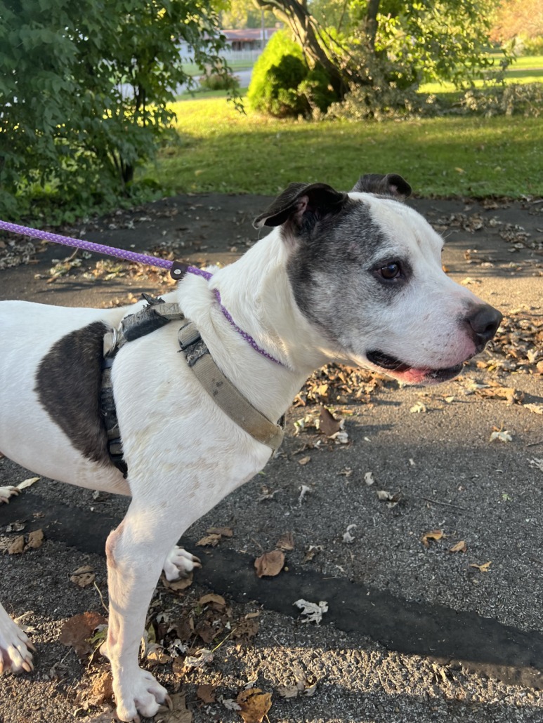 Very strong, very friendly male dog with a harness no collar. We cannot keep the dog much beyond an hour because we have a reactive dog of our own.