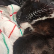 He’s a black and white tuxedo with long white whiskers. He has bald spot near his ears. And his fur is long and soft