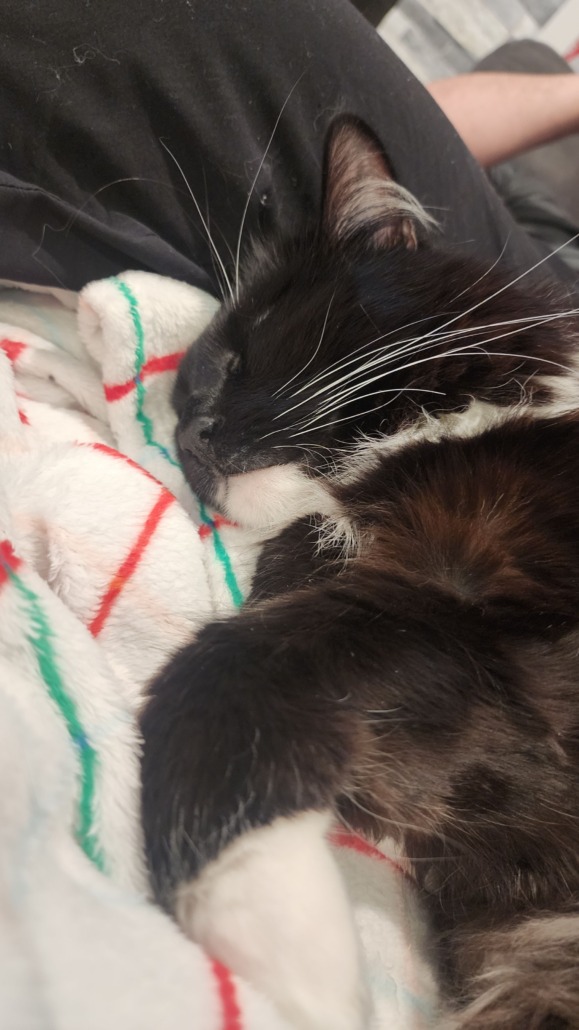 He’s a black and white tuxedo with long white whiskers. He has bald spot near his ears. And his fur is long and soft
