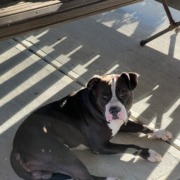 Black and white male pit bull/boxer with a blue collar but no tag. Looks like he has a cut on his leg.