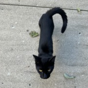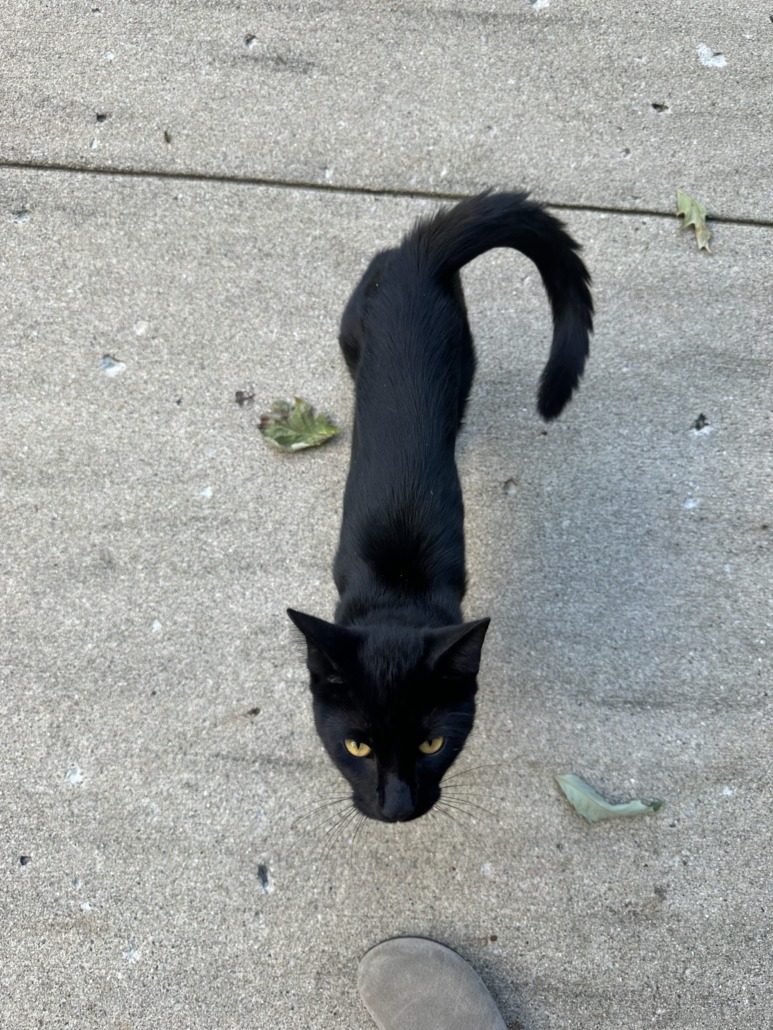 Very underweight black cat. Extremely friendly, yellow eyes. Looks to be about 6 months.