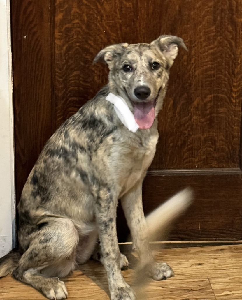 Brindle large breed female puppy. Possible Dane and shepherd. Approx 6-8 months old. Very friendly and sweet. Collar description and proof of ownership is required.