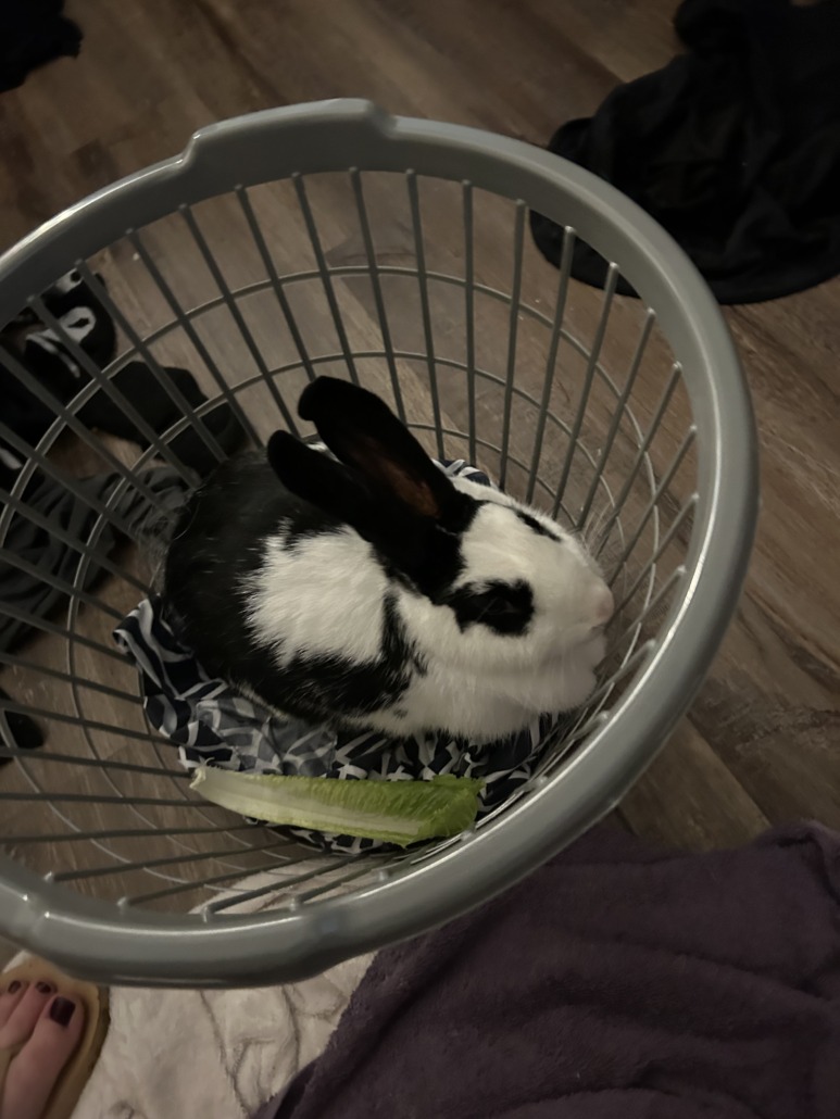 Black and white spotted Rabbit Found. It is safe. I will be making inquiries for safe shelter as I cannot Proof of ownership is required.