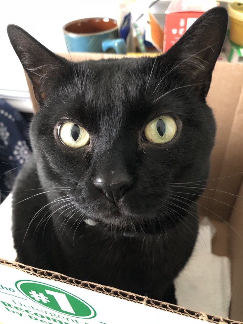 Skiddish 13 year old all black male cat. 11lbs but looks smaller. Has all claws, neutered, no collar, no microchip. His name is Zulu. Has very slight graying on front paws.