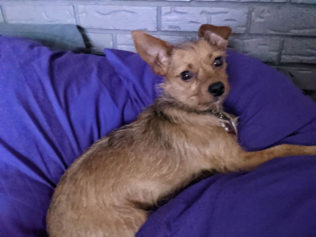 Brown and black Chihuahua mix. Very sweet girl and she LOVES every new person she meets, but probably terrified right now. Her name is Zelda Louis and may hear me calling to her if she’s close by. Please help me find her. I came home to my front door wide open and her gone.