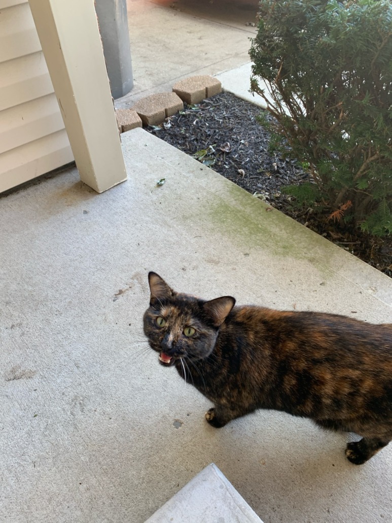 Female, tortoise color cat with white tip on tail, very friendly and talkative. Follows around the yard.