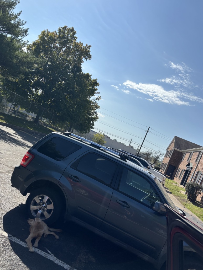 Severely malnourished golden retriever sitting next to a vehicle. On south side Indy at capital place apartments near the back looks to be trying to find its owner , whining and laying down. Looks to be between 5 or 7 months old I was driving through and I almost hit the poor puppy. He’s now going towards the middle of the place