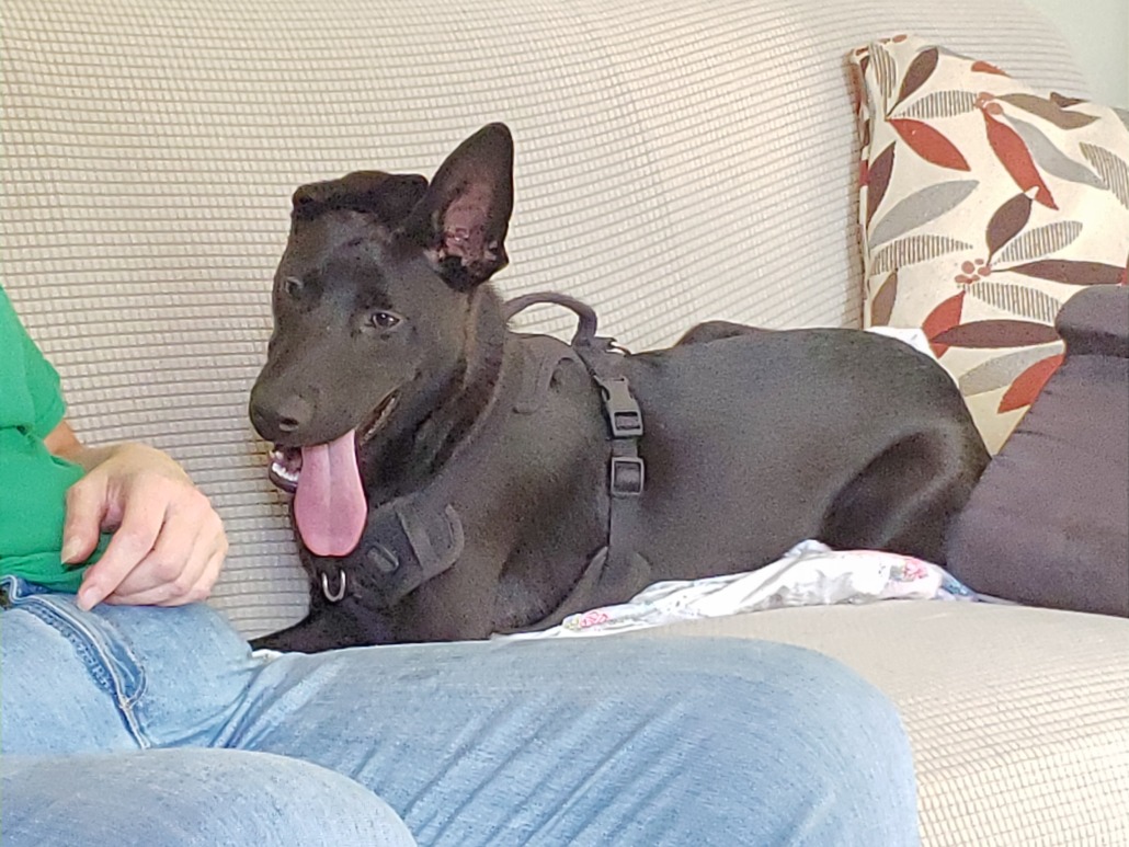 Black short haired puppy. Smallish. Probably be a largish medium when grown. Guessing 4 to 6 months. Still has puppy teeth. Energetic disposition. Friendly enough. Seems house broken.