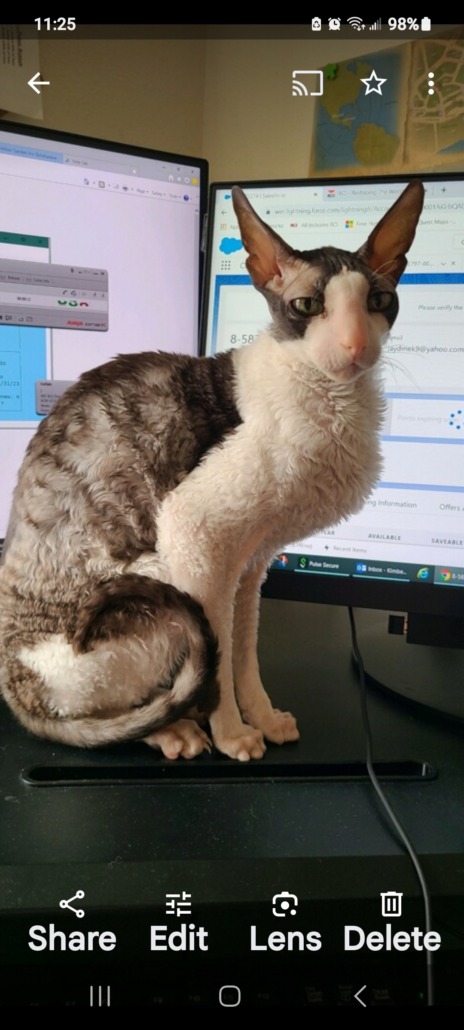 White and gray Cornish Rex.