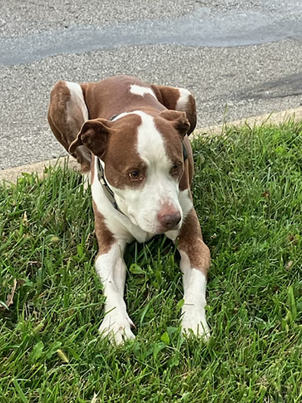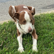 Large brown and white male. Had a collar on with a tracker on the collar.
