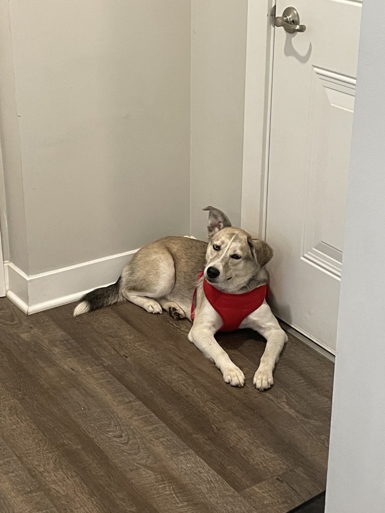 Proof of ownership is required. Medium sized dog. Perhaps a husky collie mixed mutt. Very calm and sweet. No microchip or collar (red harness is mine)