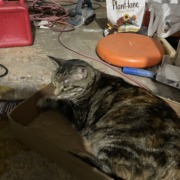The tabby cat is very friendly and loves pets. It somehow snuck into my garage. The pet is tabby, but has a variation of gray, black, and brown.