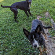 Two primarily-black dogs, medium size, one with white chest markings, one with white muzzle and brown leg markings.